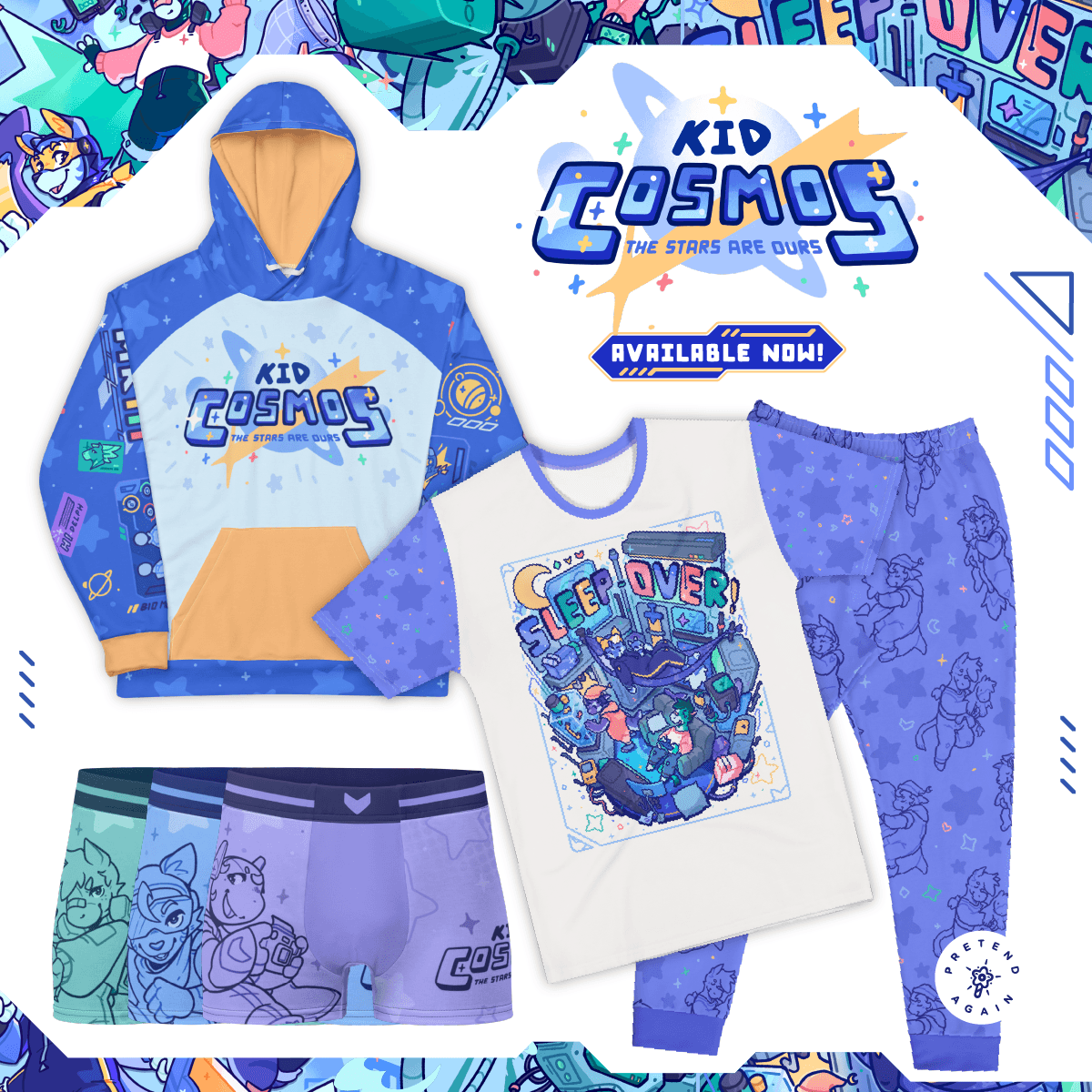 Ready to relax? No you’re not - you need the Sleep Over! T-Shirt, capturing the heartwarming off-duty moments of the Kid Cosmos team. This is the tee that hugs you back during late-night movie marathons and truth-or-dare giggles. It's the downtime uniform of champions, crafted with sleepy smiles and a dash of team spirit.